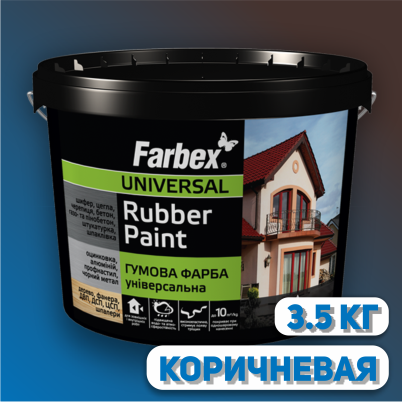 Краска резиновая "Farbex" предназначена для защитной и декоративной окраски шифера, черепицы, ондулина, оцинкованной стали, алюминия, загрунтованного и незагрунтованного черного металла, профнастила, асфальта, асбоцемента, бетонных, пено- и газобетонных, кирпичных, оштукатуренных, зашпатлеванных поверхностей, фанеры, ДСП, ЦСП, ДВП, деревянных, гипсокартонных поверхностей, поверхностей оклеенных обоями и т.д.