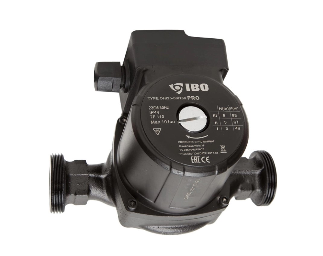 Максимальный напор циркуляционного насоса OHI PRO 25-60/180 чугун составляет 6 м, при этом, максимальная производительность данных насосов достигает 3.3 м⊃3;/час. В циркуляционный насос встроен электродвигатель мощностью 93 Вт, работающий от сети 220 В.